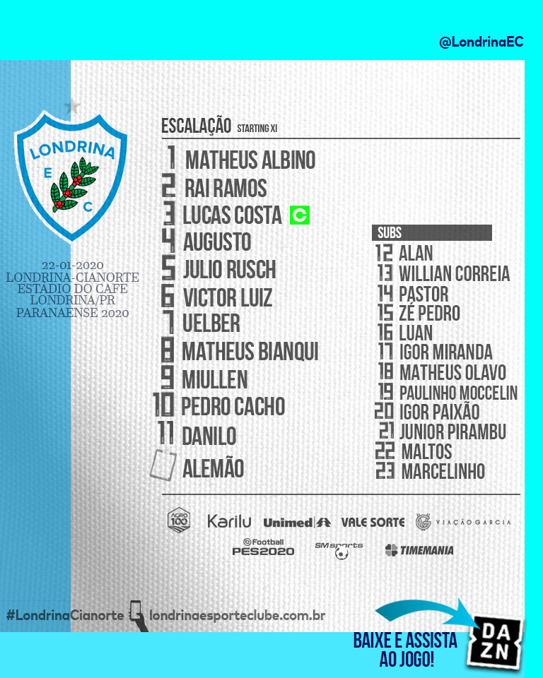 Boa noite, torcedor Alviceleste! Daqui a pouco, às 19h30, no Estádio do Café, o Londrina Esporte Clube entra em campo pela segunda rodada do Campeonato Paranaense de 2020 contra o Cianorte!